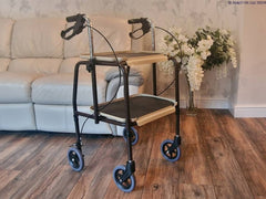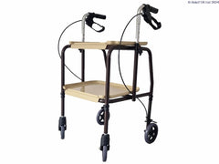 The metal frame is lightweight but also durable, and the plastic trays clip on securely to reduce the risk of spillages. Despite the secure attachment, they are easy enough to remove in order to clean and sanitise the trays and frame. By seating the bottom tray slightly forward in relation to the top tray, this trolley is designed to ensure the user can walk with ease without the risk of their legs making contact with the frame or tray.By adjusting the handles, the user can ensure that they are placed at the ideal height for comfort between 64 and 95cm and the added bonus of brakes on both rear wheels gives an added element of safety and control. The brakes also lock into position by pushing down on the handles; ensuring that the trolley won t roll away from the user if they have to let go for any reason.