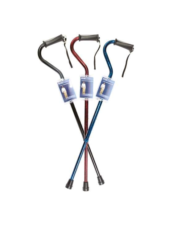 The Offset Cane with Foam or Soft Grip Handle in black is designed for users who are unstable on their feet and place a lot of weight on their stick. The shaft is angled, enabling a users weight to be transmitted centrally for improved stability. The canes are constructed from sturdy, yet lightweight, 2.2cm aluminium tubing and includes a wrist strap to prevent the stick from dropping when not in use. The height can be adjusted with a simple push button, from 76-99cm (30-39").