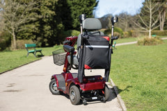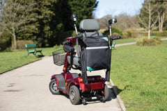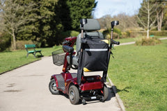 This strong durable bag is ideal for any wheelchair and most scooters with or without a headrest. There are two side sleeves to place crutches or walking sticks. It has one main compartment, a small zipped front pocket and a front net pocket. There is a reflective strip for safety.