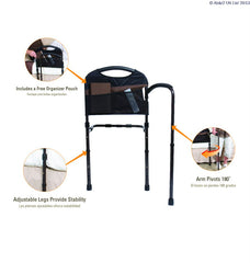 The Mobility Bed Rail has legs that extend to the ground for extra stability while standing. And the 3rd pivot arm provides extra support when walking-away or transferring to a wheelchair – adding even more support to your bed rail! The Mobility Bed Rail will help you get in-and-out of bed, protect from falling out of bed (click for full-fall protection), and stabilize you while you walk or transfer. And of course, like all of our products, it blends in with your bedroom so you can maintain the comforting feeling of your home. Max user weight 136kg (21stone).  - Height adjustment from floor to top of handle: 79-112cm  - Height adjustment from mattress base to top of handle: 45-57cm - Rail width: 46cm - Height range from the floor to horizontal support structure under -  mattress: 34-55cm - Depth of horizontal support structure under mattress: 51cm - Mobility Arm: swings out 48cm away from bed - Max User Weight: 136kg (21 stone) - Weight of product: 4.7kg - Made of: Steel frame with durable powder coat finish. Cannot be used on UK profiling beds.